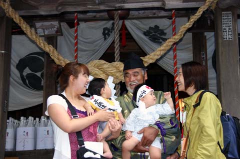 神社前で行司さんに抱いてもらって記念撮影できます。
