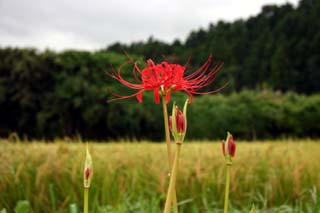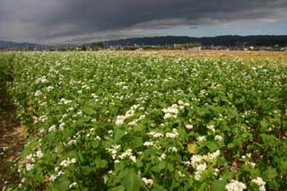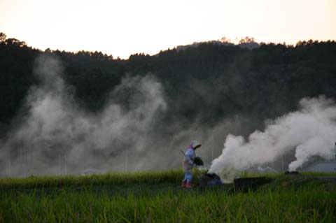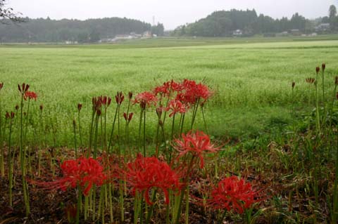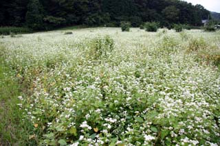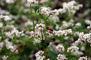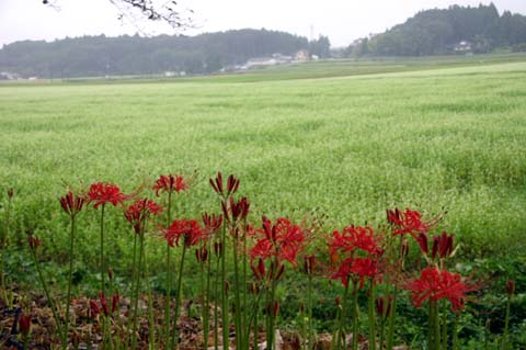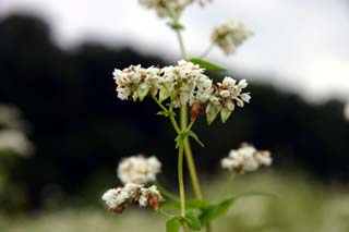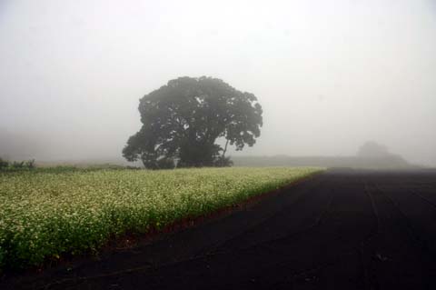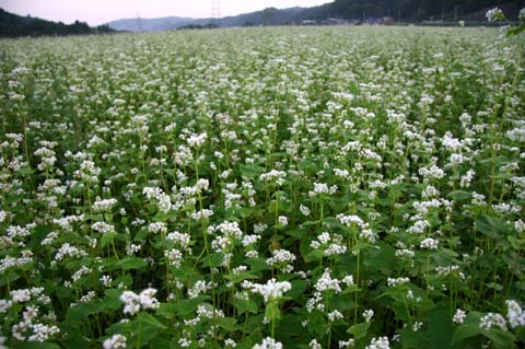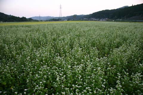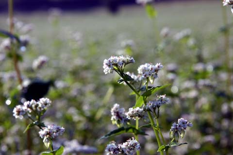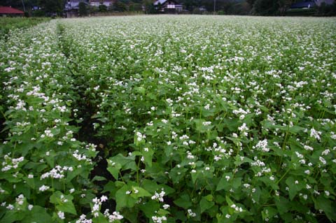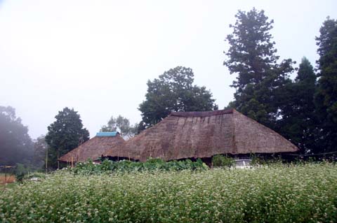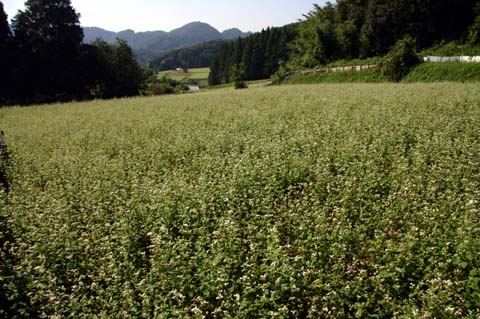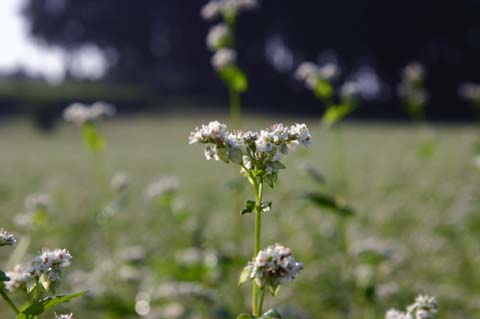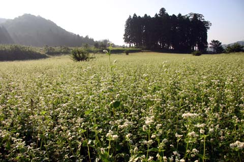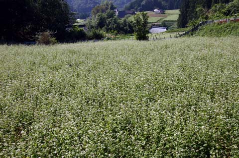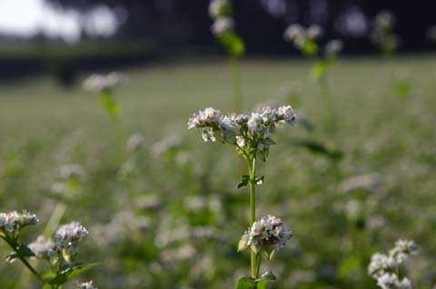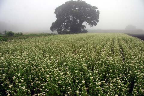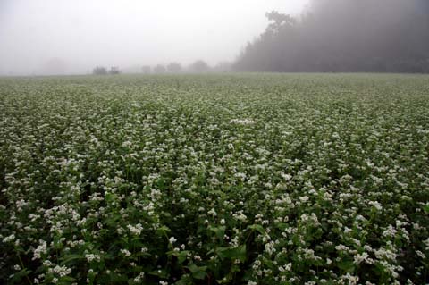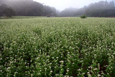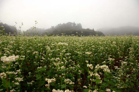 今日この頃、金砂郷、水府、里美では常陸秋そばの満開時期です。朝7時頃がそばの開花する時間で一番白く輝き、ミツバチがブンブンと飛び回っています。また霧の出る朝もあり、かやぶき屋根と白いそばの花、赤い彼岸花、黄色い稲穂が鑑賞できます。