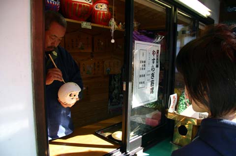 だるま市では買ったダルマに片目を入れ、背中に商売繁盛、開運・勝運、家内安全などの願い事を金文字で書いてもらえます。