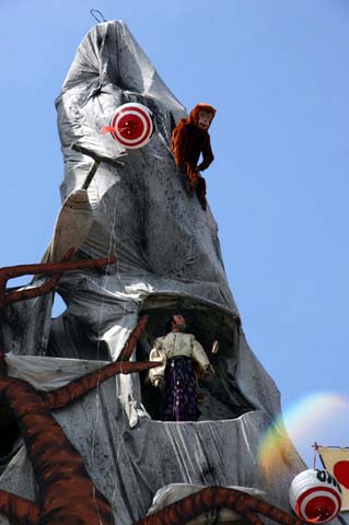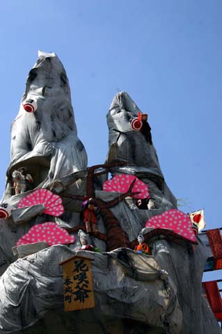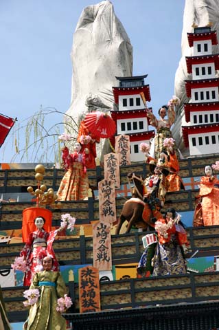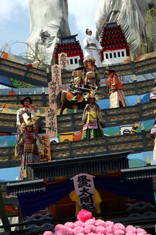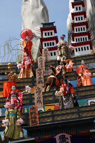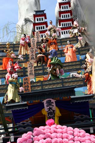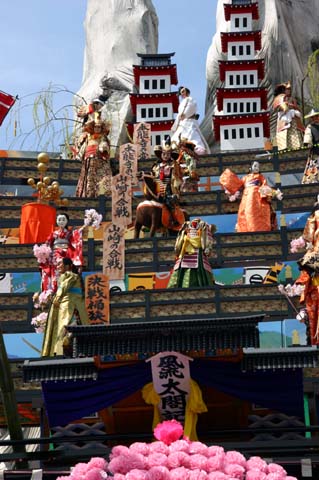 (下左の写真)各層に2から3体の人形が登場し右へ左へ動き、あるいは武者が弓を射ります。