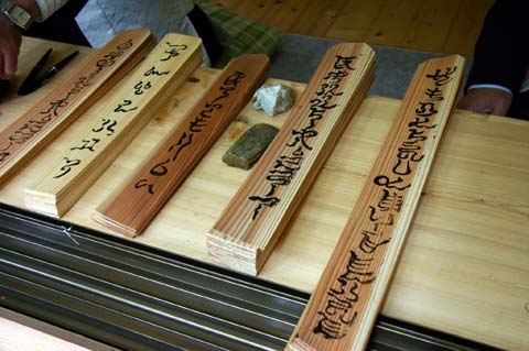 書いてある文字は読めない、神主さんに聞いたところ漢字が伝わる以前の日本の文字だそうです。