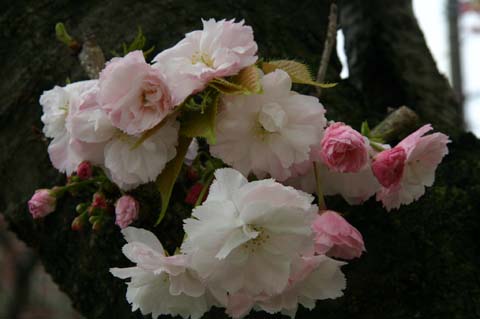 関山(カンザン)サトザクラ系 桃色 広く植えられている八重桜の代表的品種。枝が内側に曲がって弓なりなる特性。