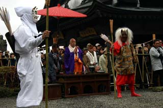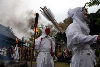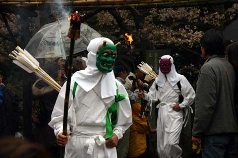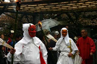 次にけん族といわれる白鬼、赤鬼、茶鬼、緑鬼、紫鬼が手に松明を持って石段をのぼり、結界を通過後本堂に上がります。