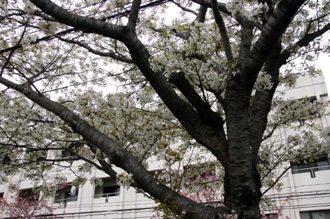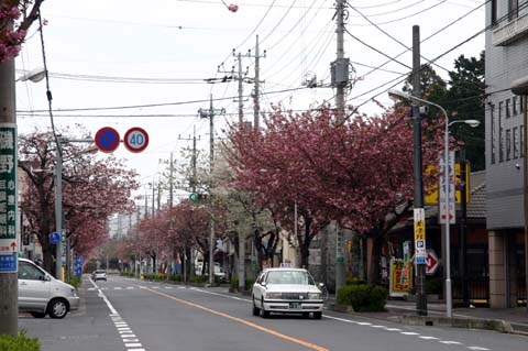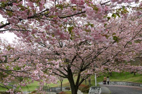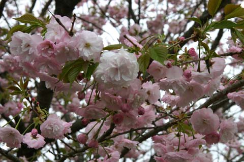 ソメイヨシノは散り急ぎ、八重桜は2,3分咲きでほのかな良い色に染まっています。