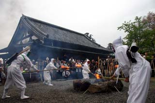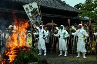 竹矢来の内側には、柴燈護摩壇がすえられ、そのまわりに檀家の人々や鬼神が並びます。