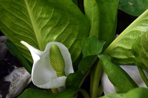 水芭蕉はすでに葉っぱが大きい、桜は満開