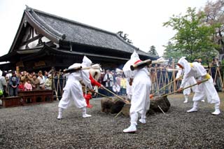 摩多羅鬼神が「ドム」、鬼は「ホイ」と掛け声をかけながら、松明を振り上げ振り下ろし木を切る所作を行います。