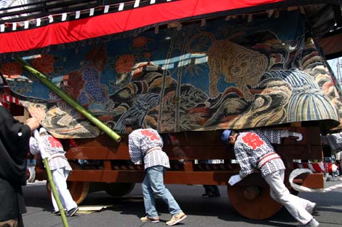 重さ150トンのジャンボジェット機はトレーラーで軽々駐機場から乗降口まで引き出せますが、風流物の山車にはエンジンがない、ハンドルがない、人力でやるしかないわけです。