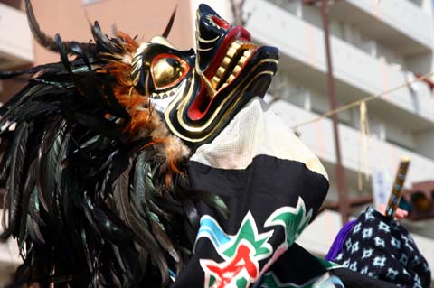 すりこみ/前庭の冒頭の演技で、獅子が頭を振り、長い髪の毛を振るわせながら舞います。