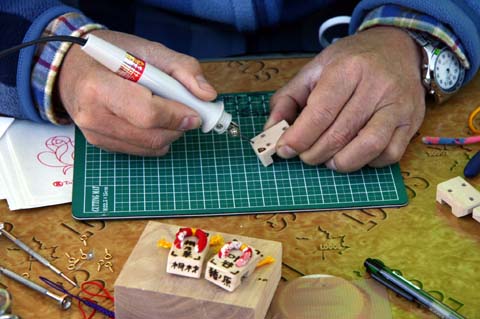 小さな半田ゴテで模様や名前を入れる作業、自分の名前を入れてもらうといい記念になりそうです。