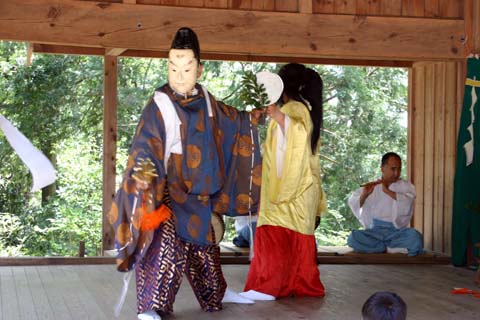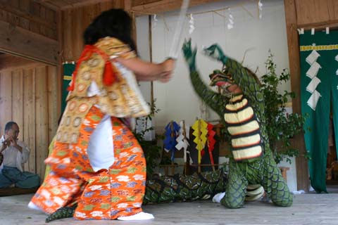 「スサノオノミコトのヤマタの大蛇退治」他の神楽では見られない場面で、櫛稲田姫にヤマタの大蛇が襲いかかろうとするところに、スサノオノミコトが剣をもって現れ、酒を飲んだ大蛇を退治するというおもしろい舞です。