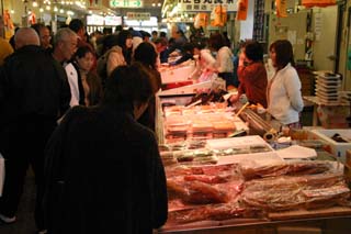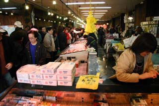 店内には様々なお魚が所狭しと並んで目移りがします。「 安いヨー!安いヨー!」の声しきり、「○00円引きだよ!」の声につい買ってしまいそう。