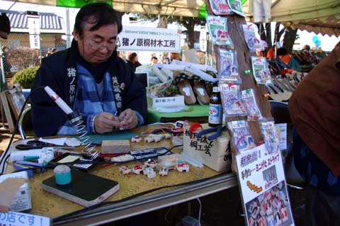 小栗判官まつりでは旧関城町の猪ノ原桐材木工所が出店し、新発売のミニ桐下駄のストラップ・ブローチを実演販売していました。