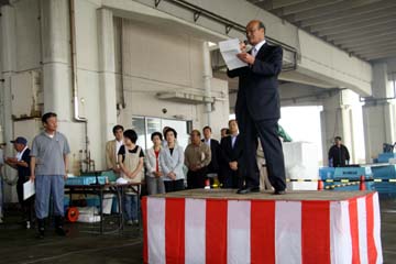 カツオ祭の開会に先立ち組合長、市長、県会議長、県会議員のあいさつがあり、その後来賓を競り人として祭りに集まった人たちがカツオの競りに参加できる模擬競りが行われました。