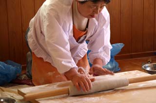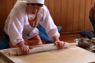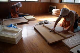 竜神峡への途中にある農産物直売所では朝早くからそば打ち名人のお母さんたちがそば打ちに精をだしています。