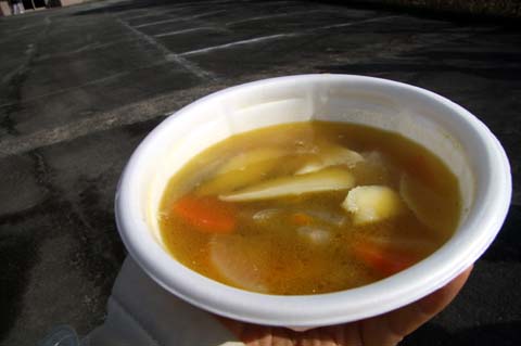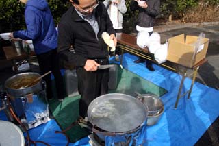 大根、にんじん、かぼちゃ(南京なんきん)、ほうれん草、さやいんげん、こんにゃく、すいとんなど「ん」がつく食材がたっぷりの七運汁が無料で提供されました。おいしい、体があったまる、特にすいとんはなつかしいお味でした。
