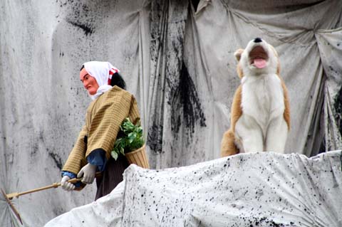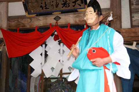 舞台ではヒョットコが魚を獲る仕草をしながら、集まった子供たちとじゃれあうようなひと時があったのち、釣り竿をもった恵比寿様が現れ、鯛をつる仕草を行います。
