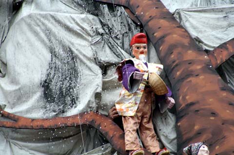 紅白の餅、カップラーメン、カレールー、ポップコーン、味噌ラーメン、テッシュペーパー、タワシ、袋菓子類、タッパ・・などアメアラレと降ってきて、受け止めようとする手、手、手。・・・