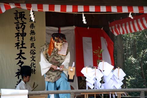 上山川諏訪神社では毎年4月3日、五穀豊穣を祈る「神武祭」のおり、「諏訪神社太太神楽保存会」の皆さんにより、太太神楽が奉納されています。