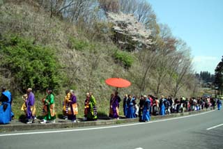 女の子は赤い衣装に天冠、男の子は緑の衣装に烏帽子をかぶった子どもたち約200人とその家族、住職、役員など総勢600人が大山寺までのほぼ2キロメートルの道のりを練歩きました。