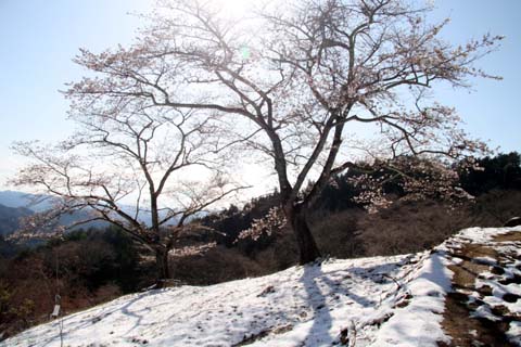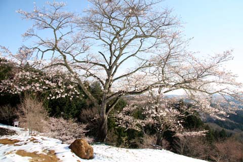 峠からの眺めがすばらしく、ヤマザクラ越しに奥久慈の山並みを見通すことができます。