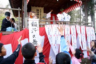 さらに大黒様が小槌を持ってあらわれ舞い終わると、二人で餅をまきます。