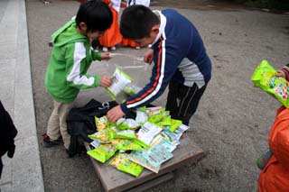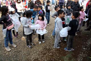 餅まきの時間近くになると子供たちが集まり、大きな袋にいっぱいの駄菓子を拾って大喜び。