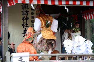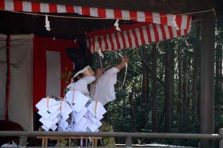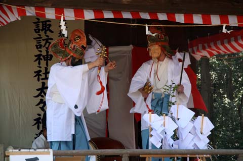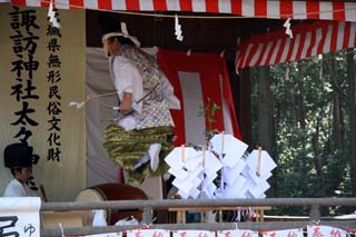 上山川諏訪神社太太神楽では紅白のお餅を餌に、観客がお祝儀として差し出すお札や酒一升を釣り上げるなど、地域のみんなが参加して楽しめる演目です。