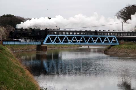 舞の途中に汽笛がゴーッと聞こえ、大前神社の東側を流れる五行川に出てみると、真岡線を走る昔懐かしいSLの雄姿をカメラにおさめることができました。
