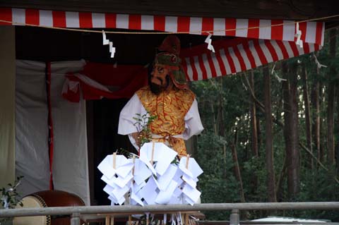 稲刈(女神)の舞:ピンクの狐面をつけ、折敷の切り紙をまき散らす。