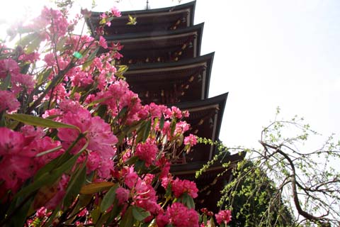 鳳台院は巨大な達磨の像や朱塗りの五重塔で知られるお寺で、松田童龍住職が30年ほど前から植え始めた石楠花が、庭園を回遊できる形で楽しめます。