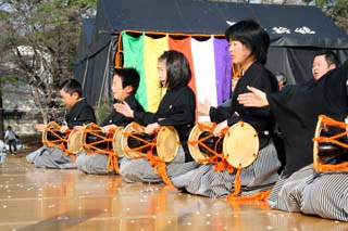 太鼓を叩いているのは中学1年生の少年、その少年のおじいちゃんが横笛を吹いています。