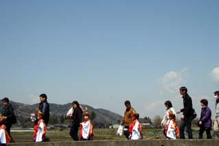 鯛釣りの後に大量の餅やお菓子がまかれ、これをねらって子どもたちが集まり、ワイワイガヤガヤ、農家のおばさんは畑から直行し、最初から捕球体勢に入り、地べたに陣取っていました。