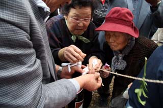 仁王門に着くと御詠歌の流れる中、お坊さんと握手をし頭に聖水をいただき健康を祈る儀式がなされ、地元住民でつくる「桂むらおこし会」から「笹にあられ」の記念品を手渡されます。