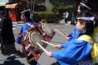 この春小学1年にあがる子から中学2年生まで11人のこどもたちが太鼓をたたくものの、小学低学年では背丈が太鼓に届かず、お母さんたちが参加をします。小さな子供たちは次回小祭礼の主役となれるよう、行列して歩きます。