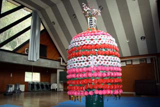 6色のお花を300個つくり、買った造花200個と合わせて飾り付けます。