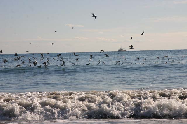 かもめがいわしをねらって水面に