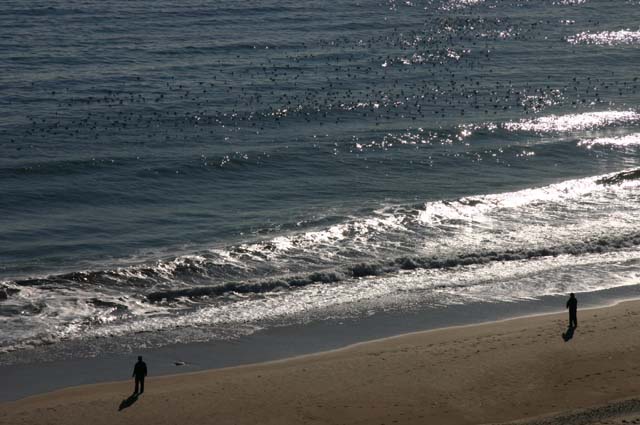 波打ち際ではカタクチイワシがはねる。
