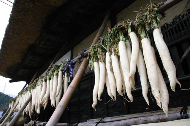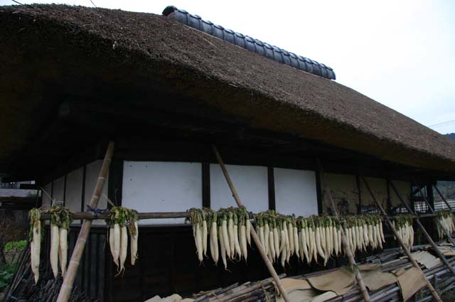 茅葺きの軒先にずらりと大根干し