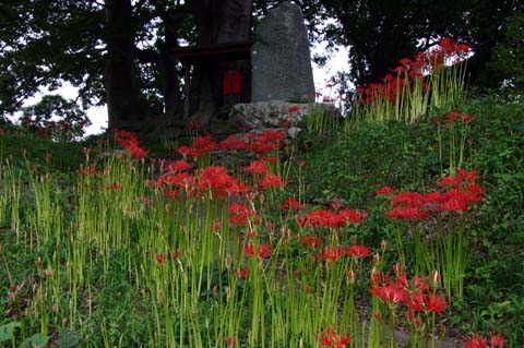 地蔵さんや馬頭観音、石塔などが数体立てられている小山に彼岸花が群生しています。