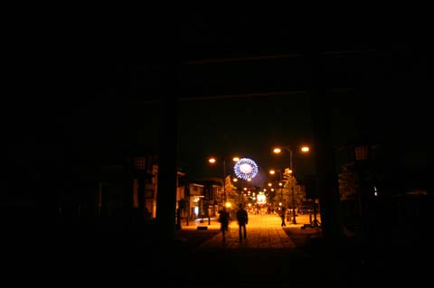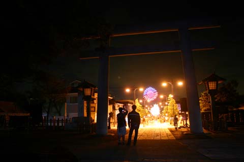 雅楽の夕べが終わり、「あらっ!花火が見えるわ」と巫女が指さす先を見れば、鳥居越し大町通りの先に花火があがっているではありませんか。