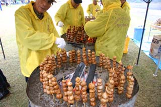 左:芋串・茹でた里芋を一度焼き、味噌ダレをつけてもう一度炭火で焼くと香ばしい香りが食欲を誘います。