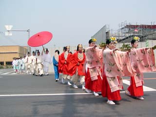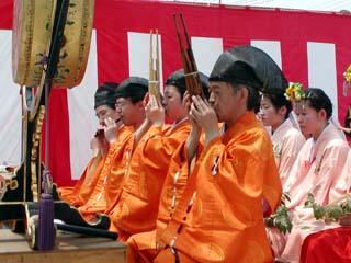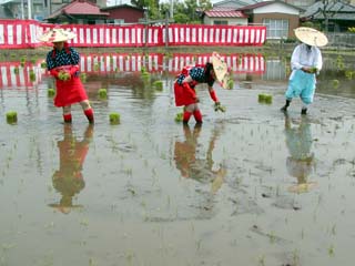 茨城県内で行われるお田植え祭の中では雅な舞や雅楽の演奏が繰り広げられるので特に見もので、田んぼに映る花笠に赤いタスキの早乙女の姿は実に美しいものです。