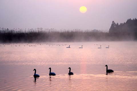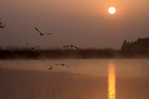 赤い朝日に白鳥が入る光景もすばらしい。