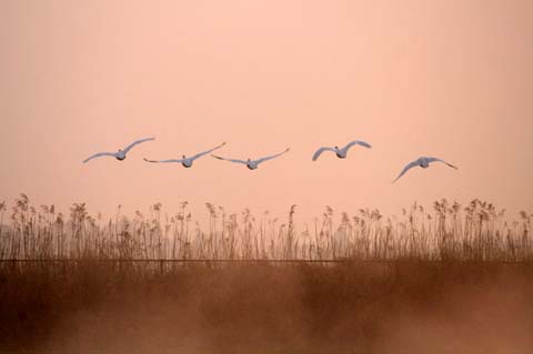 真っ赤な朝日が昇り、白くぎらつく前に白鳥の飛翔がないとオジャンになります。