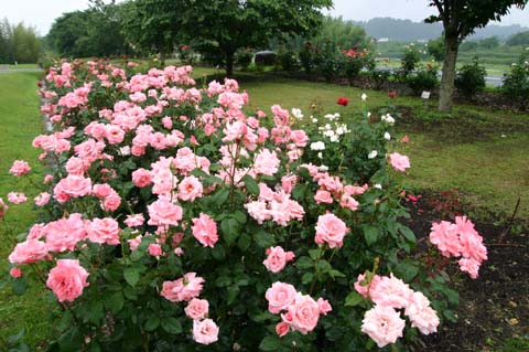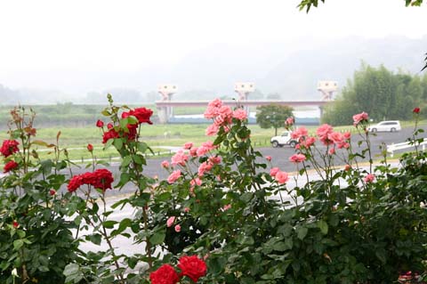 バラ園は母なる川久慈川にかかる辰口堰の下流側東岸に位置するため、雄大な流れと奥久慈の緑を背景に、彩りを鑑賞することができます。