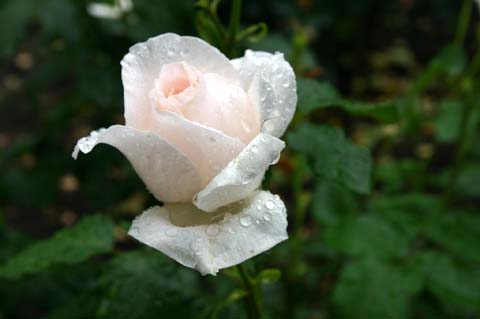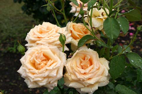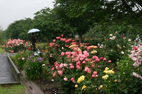 雨降りの朝訪れると、バラの花びらに水滴がとどまり、その背景には霧雨に煙る奥久慈の緑が望まれて、山水画の世界が広がっていました。