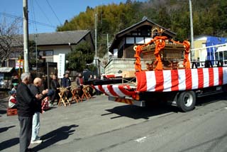 西金砂神社の神輿が山道を下るのは危険が多いので、神社からトラックで迂回して天下野(けがの)まで移送する途中、氏子4か村を、賽銭箱を持って巡ります。