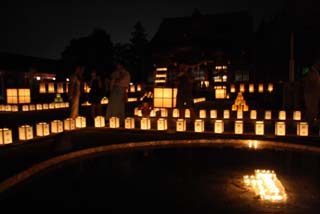 境内に千灯ほどの灯りがともり、夕暮れとともにゆらめく風情に魅せられ、また雅な舞と雅楽の調べを鑑賞し、ひと時平安絵巻にひたることが出来ました。