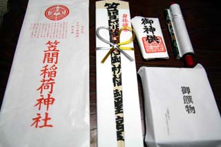 いただいたものは御札、ミニ掛け軸、御神供(紅白の落雁)、御饌物(昆布、佃煮、寒天、みかん、煮豆、かんぴょう)。